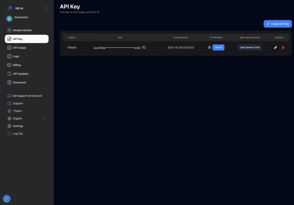 Head over to kie.ai, create your free account, and generate your personal API token.